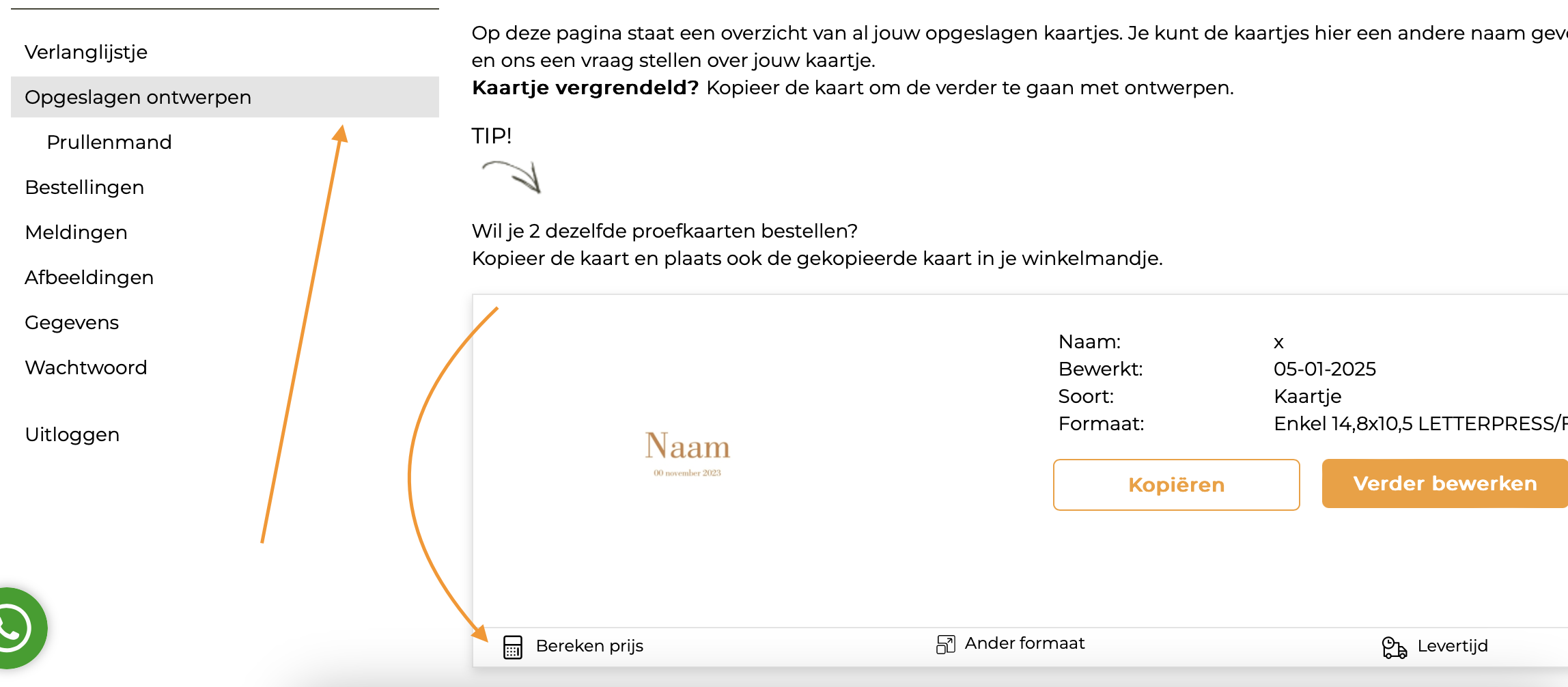 2. Heb je al een kaartje gemaakt en opgeslagen? Dan kan je bij je opgeslagen ontwerpen, in je account, op het rekenmachine-icoon [BEREKEN JE PRIJS] te klikken. Er opent een aparte pop up en hierin kan je nauwkeurig berekenen wat al jouw opties gaan kosten.