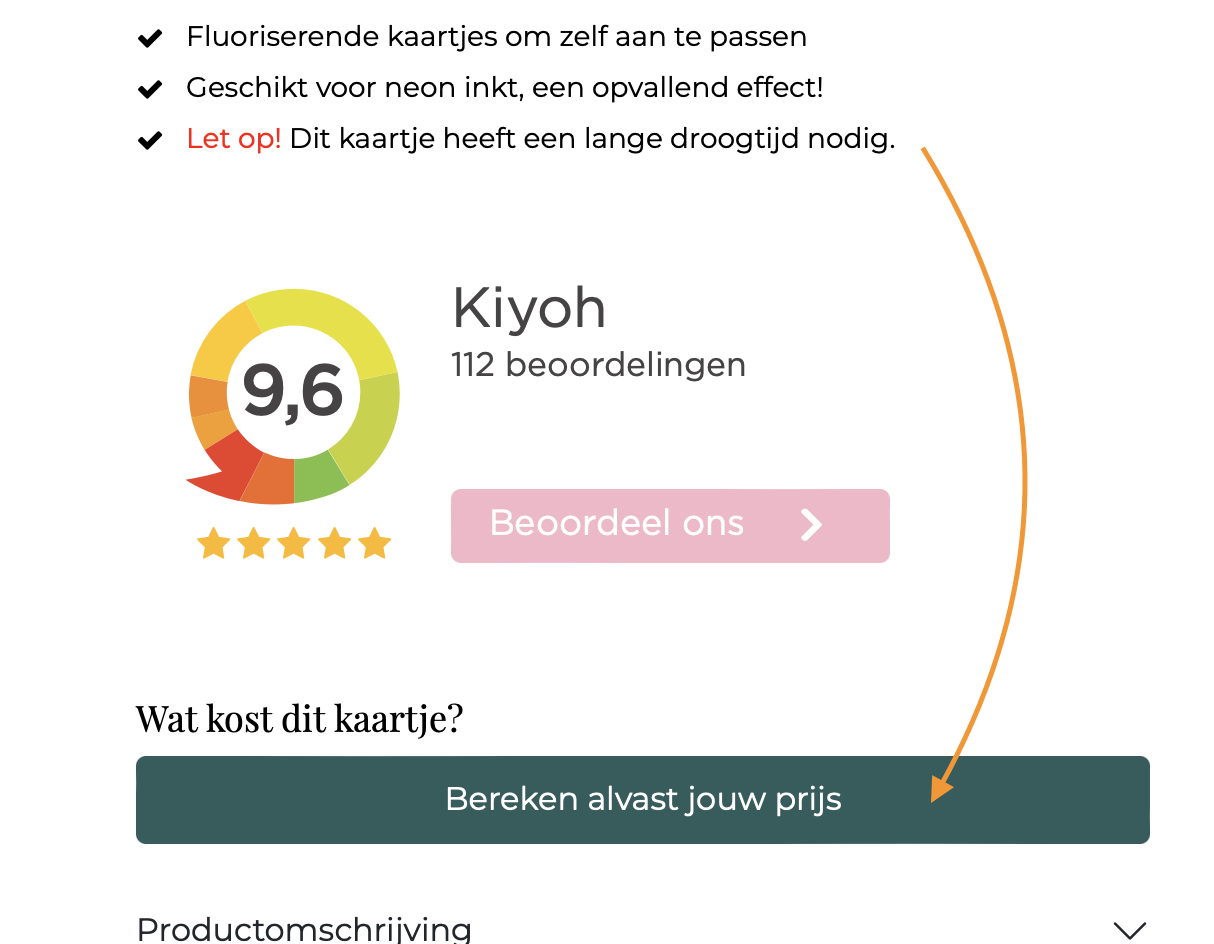 1. Vooraf, door op de gewenste kaarten pagina, op de groene button [BEREKEN ALVAST JOUW PRIJS] te klikken. Er opent een pop-up en hierin kan je zelf berekenen wat jouw aantal en druktechnieken doet met de prijs.